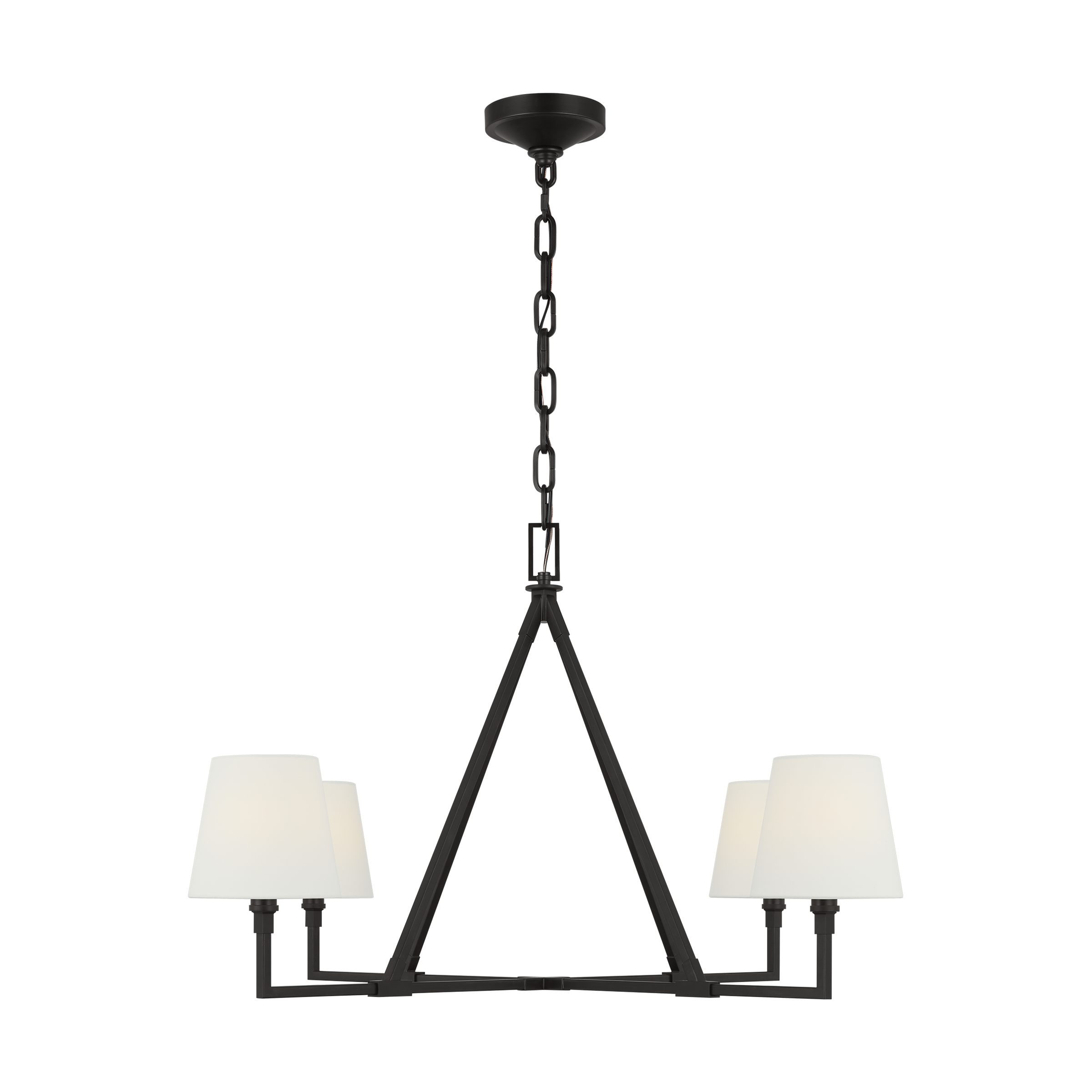 Four Light Chandelier by Visual Comfort Studio from the Perth collection in Aged Iron finish The Perth Collection is a modern and angular take on a traditional trestle form - often seen in furniture and bridges. The arms of the chandeliers are suspended from a triangular frame which both adds strength and a distinctive overall profile. Each item is made from square tubing accented with bracket details where the arms and supports intersect. {ADDITIONAL FINISH INFORMATION: Aged Iron}
